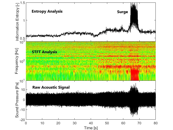 团队分别从气动热力学、气动声学和统计力学角度论述压气机喘振波的传播特性及捕获方法,将信息论中的“信息熵”概念引入到工程热物理学科叶轮机械气动热力学领域,运用学科交叉方法研究压气机内部流动失稳预警难题,并针对压气机内部流场非线性衍化问题首次提出“稳定熵”度量概念。