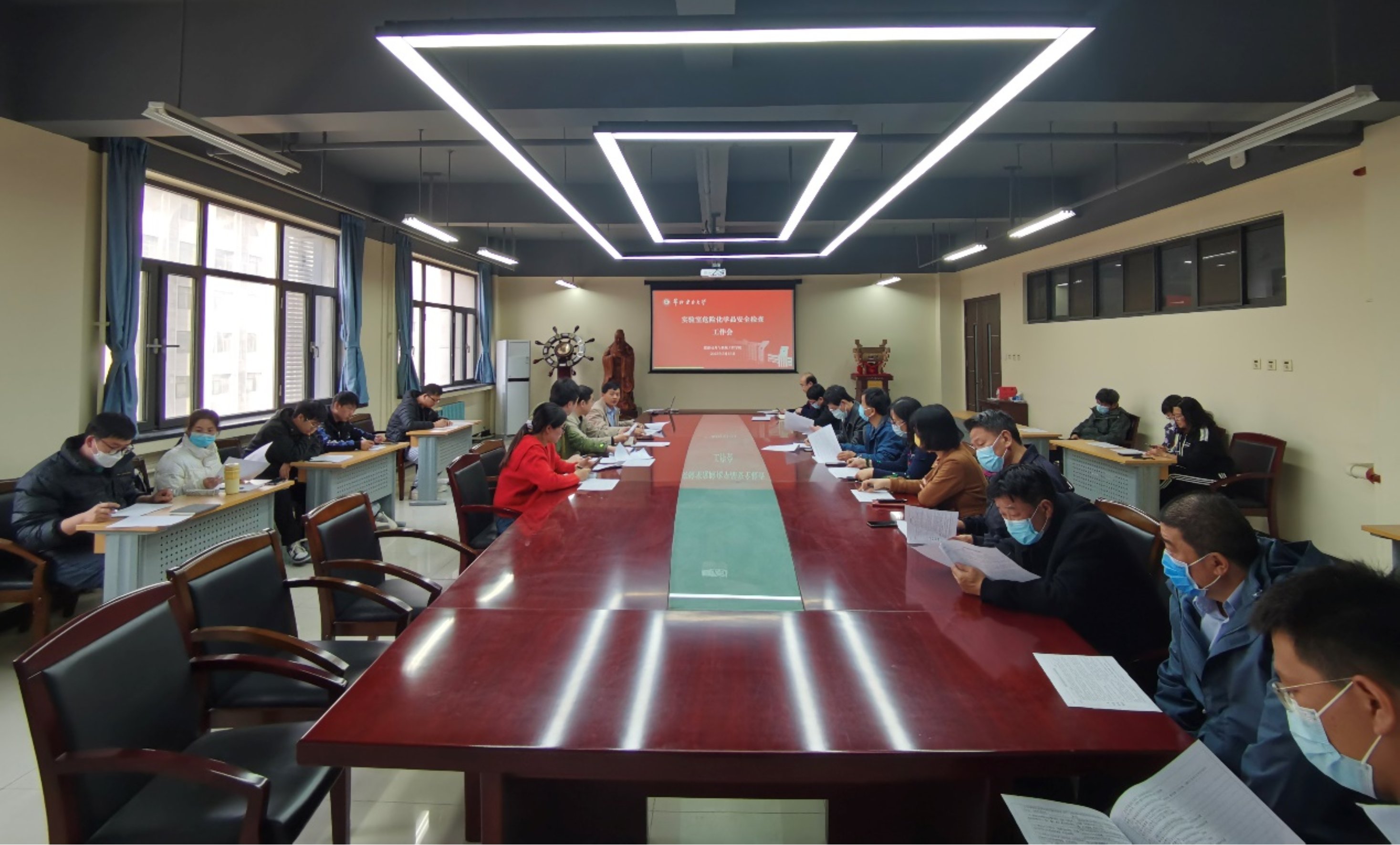 沈国清对实验室危险化学品安全检查工作进行了详细布置,他指出,各实验室要严格对照法律法规和技术标准要求进行检查,要建立隐患治理台账,明确隐患事项、责任人、整改措施、整改期限,及时整改。实验管理处刘钊老师对学校实验室危险化学品安全管理专项治理工作进行了详细说明,要求各院系要认真摸清实验室基础管理情况、危化品(含气瓶)的全流程管理情况和涉危实验室安全基础设施建设情况,利用对照表,认真开展自查自改,要列问题清单,制定整改方案,落实相关经费取推动实验室安全基础设施建设,最后学校将进行专项检查验收,确保工作落到实处、收获实效。席新铭要求各实验室结合自查情况和安全评价情况,全面梳理实验室每个部位、每个环节、每个岗位存在的安全风险和安全隐患,按照学校要求及时整改,消除安全隐患。